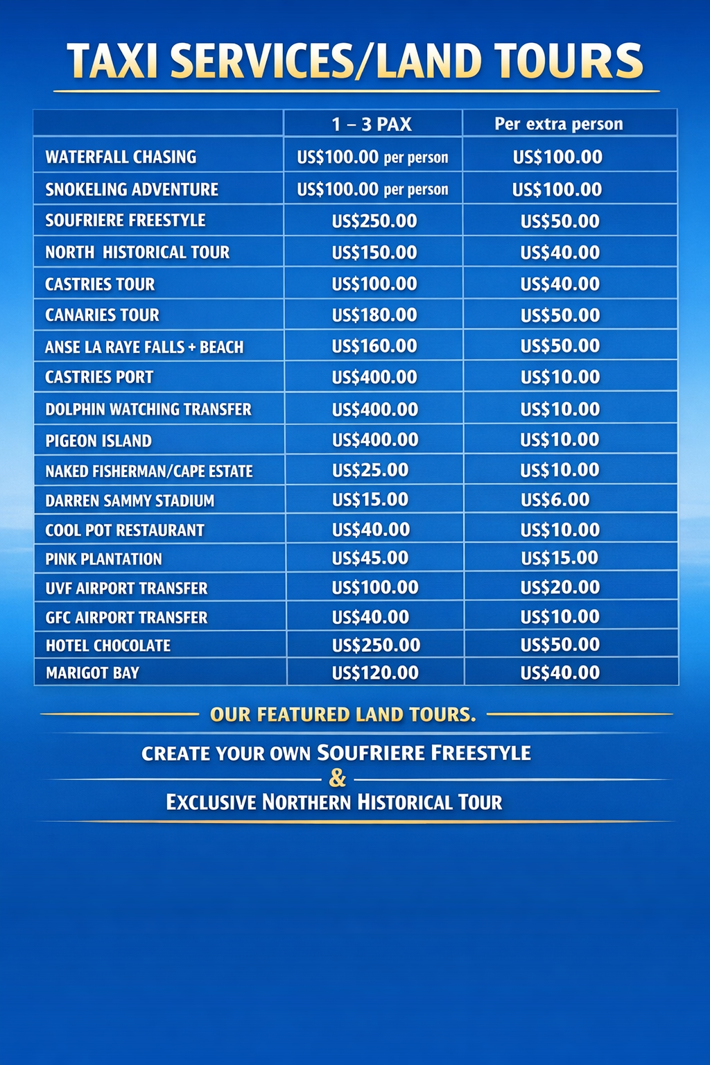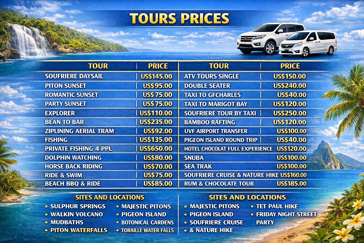 Full day cruise to Soufriere , view the majestic piton. Visit our iconic walkin volcano or take a deep in our exotic mudbaths. Exhale under one of our luscious waterfall. Enjoy a delicious lunch. Swim and Snorkel. Photos opportunity at marigot.